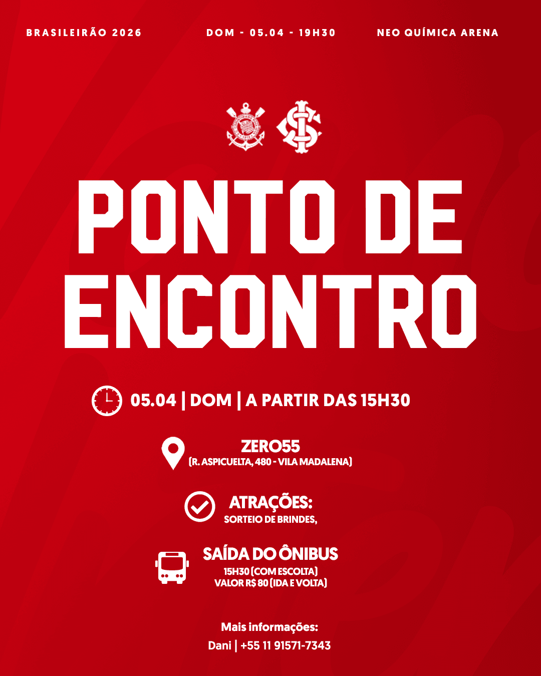 A partir das 15h30 deste domingo, colorados e coloradas poderão aproveitar o pré-jogo no Ponto de Encontro do Relacionamento Social do Inter. Com sorteio de brindes, o restaurante Zero55, localizado no número 480 da Rua Aspilicueta, receberá a torcida do Clube do Povo e servirá de ponto de partida para o ônibus que seguirá escoltado até a Neo Química Arena.
